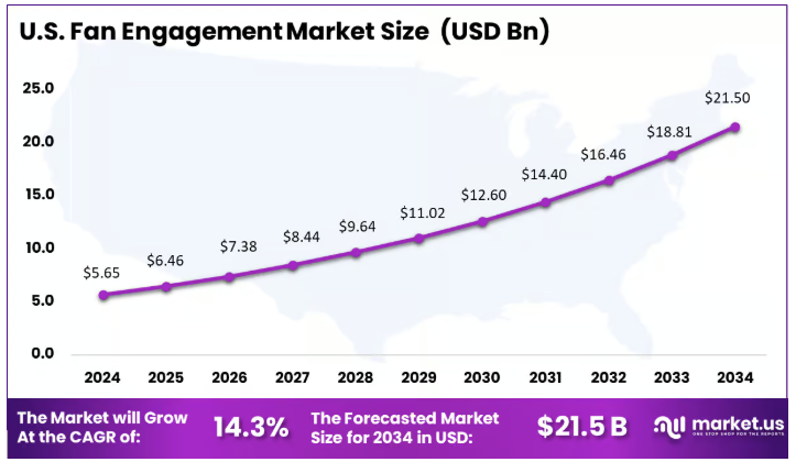 The U.S. Fan Engagement Market was valued at $5.65 Billion in 2024 and is anticipated to reach approximately $21.50 Billion by 2034